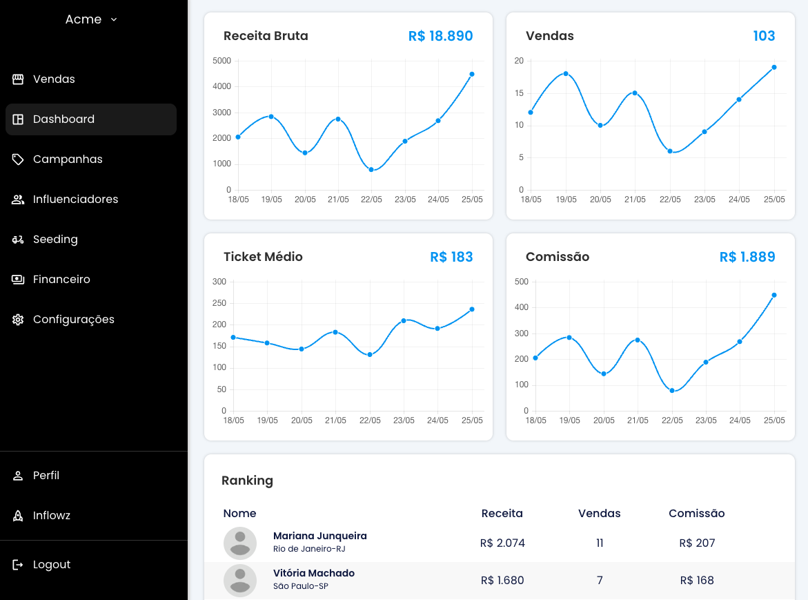Interface completa para gestão de influenciadores, campanhas e análise de resultados.