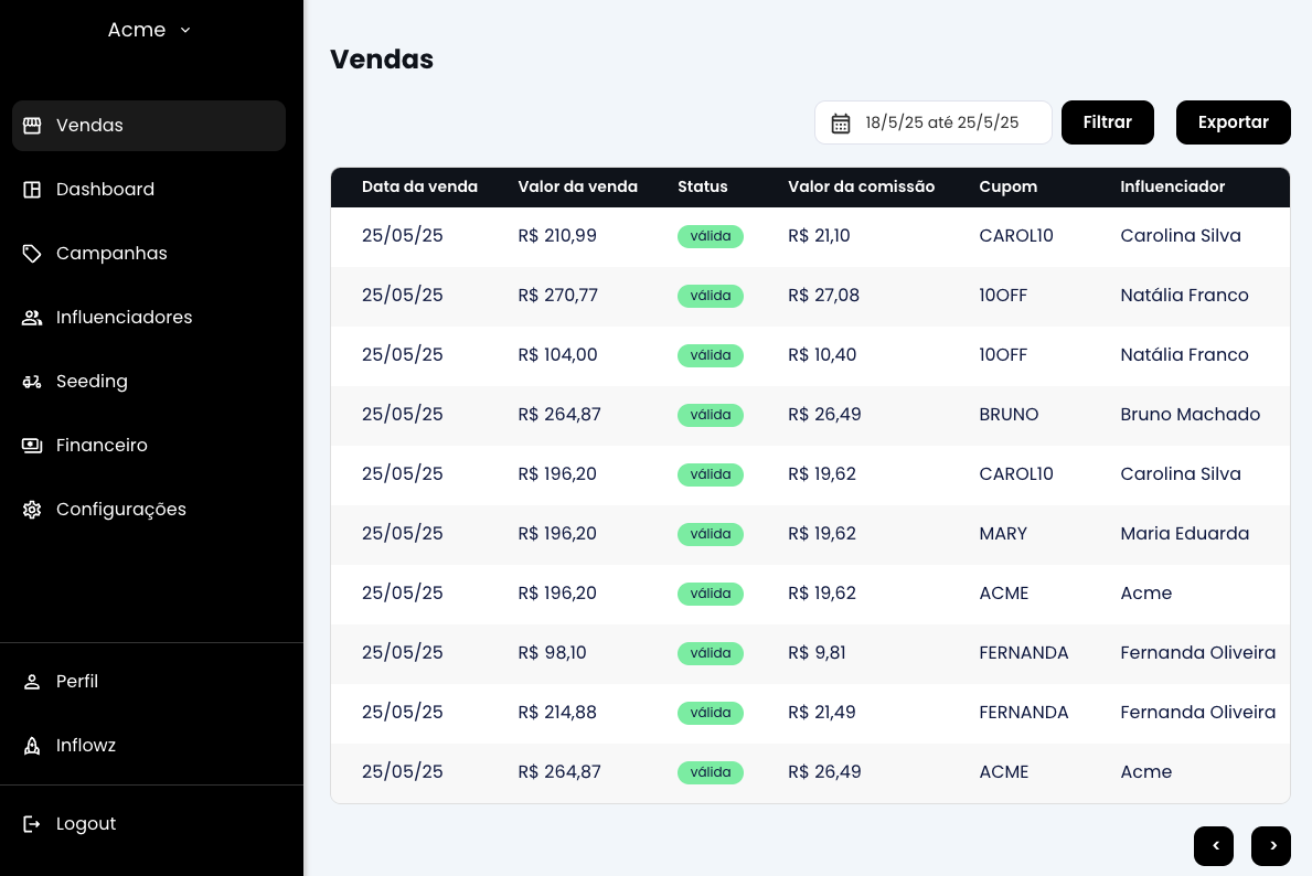 Crie campanhas para alguns ou para todos seus influenciadores, defina regras de desconto e remuneração, e acompanhe as vendas em tempo real.